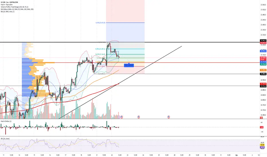 #US100, 23.263 direncinden reddedildikten sonra Fibonacci 0.618 (23.164) seviyesine kadar geri çekilmiş durumda. POC (En Çok İşlem Görülen Seviye) olan 23.098 destek olarak izleniyor. Yukarı yönlü trend çizgisi ve MA200 ile kesişim bölgesi, önemli bir savunma hattı sunabilir.