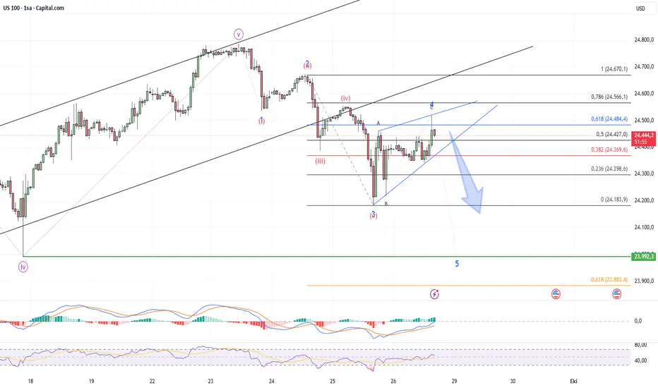 US100 endeksinde 5 dalgalı yükselişin ardından gelen düzeltme süreci devam ediyor. Şu anda fiyat yapısı, (4) numaralı düzeltmenin ardından (5) numaralı dalganın tamamlanma senaryosuna işaret ediyor.