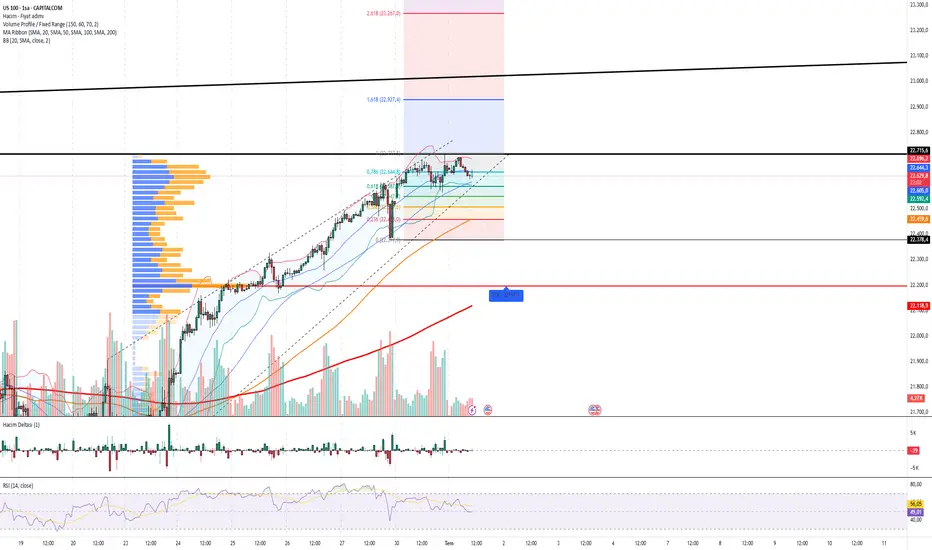 📌 ÖzetUS100, 22.715 direncinde zorlanırken destek seviyelerine doğru sınırlı bir düzeltme içinde. Teknik olarak yükseliş trendi bozulmuş değil ancak RSI’ın zayıf kalması ve hacimdeki düşüş, yukarı yönlü hareketlerde sınırlı momentum anlamına geliyor. 22.459 altı kırılımda kısa vadeli baskı artabilir. Ancak Powell veya Fed kaynaklı güvercin sinyaller, yeniden 22.927–23.267 hedeflerini ön plana çıkarabilir.