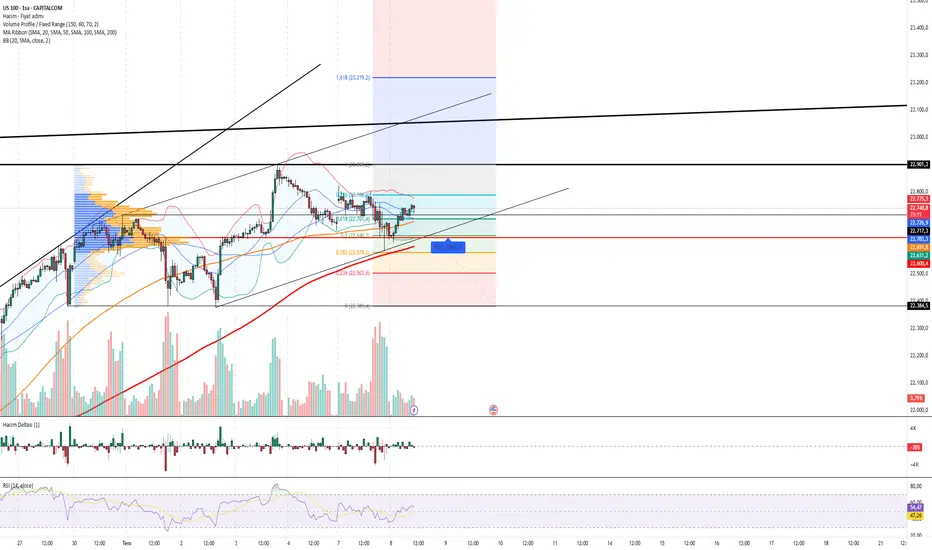 📌 ÖzetUS100 şu an 22.700 çevresinde yatay dirençle mücadele ediyor. Eğer 22.764 üzeri kapanışlar gelirse 22.901 ve 23.219 hedeflenebilir. Ancak 22.637 ve altı kapanışlar olursa düşüş hızlanabilir. Bu seviyeler hem teknik hem hacimsel olarak kritik.