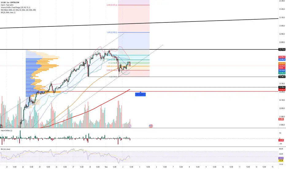Grafikte #US100, yükselen kanal içinde kalmaya çalışıyor ancak kısa vadeli düşüş baskısı dikkat çekiyor. Fibonacci seviyeleri net şekilde belirgin; fiyat 22.511 seviyesinden destek almaya çalışıyor. 22.715 direncinin kırılması yükselişi ivmelendirebilir.