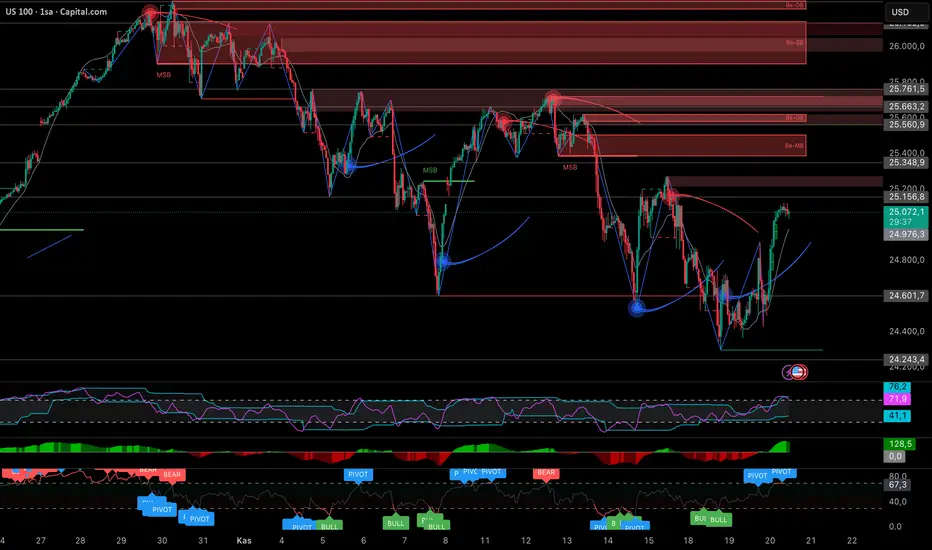 🧶Öte yandan yükseliş senaryosunda 25.200 üzerinde net bir mum kapanışı şart. Bu seviye geçildiği anda fiyatın ilk hedefi 25.348 – 25.560 bölgesindeki majör bearish OB olacaktır. Bu alan şu an için güçlü bir satıcı bölgesi olarak duruyor ve kırılmadan kalıcı bir trend dönüşü beklemek zor.