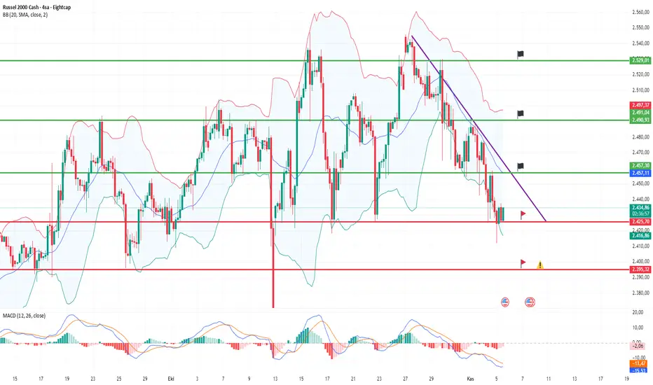 #RUSSEL2000 grafiğini incelediğimizde fiyat bulunduğu noktadan 4 saatlik zaman diliminde 2.425,70 destek noktasının üzerinde kalıcılık sağlarsa fiyat buradan pozitif yönde sırasıyla 2.490,93 - 2.529,01 direnç noktalarına kadar yükseliş gösterebilir fakat fiyat bulunduğu noktadan 4 saatlik kapanışta 2.425,70 destek noktasının altında kapanış yaparsa bir sonraki hedefi negatif yönde 2395,32 destek noktası olacaktır.