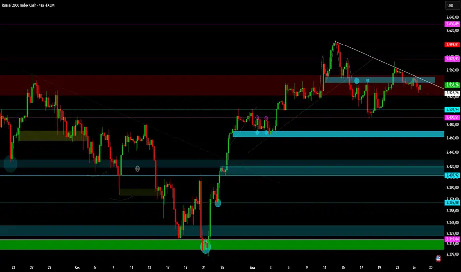 2.576 puan üzerinde net bir kalıcılık sergileyemeyen Russell Endeksi, bu bölgeden başlayan geri çekilmesini 2490 seviyesinde sonlandırdı. Akabinde izlenen fiyat hareketlerinde, beyaz çizgi ile belirttiğim alçalan trend yapısı dikkat çekiyor.