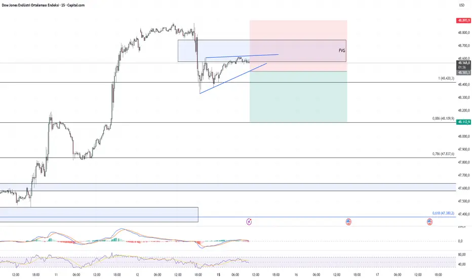 Fiyat saatlikte FVG kanalında, grafikte görünen takoz yapısını kırması durumunda sell işlem deneyeceğim. 48115 tp. 48895 üstünde saatlik kapanış stop.