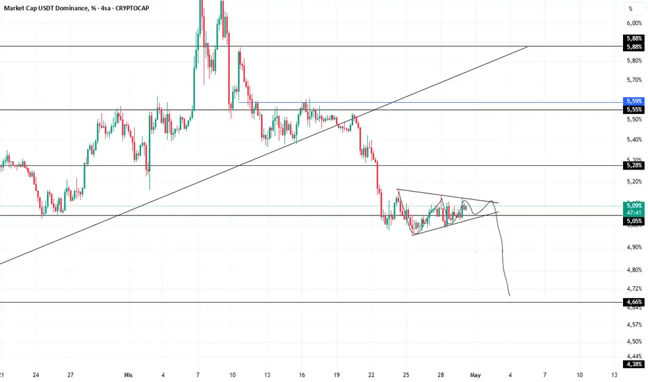 tether de bearısh pennant pattern oluşumu mevcut üçgenin aşağı kırması %5 lerden gelen bir kırılım olduğu takdirde hedef %4.66 lar buda btc de yaklaşık 99-100 k ları işaret eder bu gün ve yarın kritik veriler mevcut enflasyon özellikle takip etmek lazım.