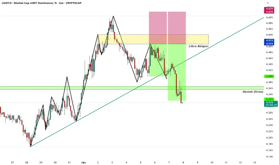 USDT.D, toplam kripto para piyasasında Tether (USDT) stablecoin’inin piyasa payını gösterir. USDT.D’nin yükselmesi, yatırımcıların kripto varlıklardan çıkarak likit ve stabil bir varlık olan USDT’ye geçiş yaptıklarını gösterir. Bu durum genellikle piyasada belirsizlik, riskten kaçış ve fiyat düşüşleriyle ilişkilidir. 1. USDT.D Nedir? o Tether (USDT) stablecoin’in toplam kripto piyasasındaki hâkimiyet oranıdır. o USDT fiyatı USD’ye sabitlenmiş olduğu için yatırımcılar volatil piyasa dönemlerinde güvenli liman olarak USDT’yi tercih eder. 2. USDT.D Yükselirse Ne Anlama Gelir? o Piyasa risk iştahı azalmış demektir. o Yatırımcılar riskli kripto varlıklardan çıkarak ellerindeki sermayeyi USDT gibi stablecoinlere çevirmektedir. o Bu da genel olarak kripto para fiyatlarında düşüş, piyasa volatilitesinde artış ve satış baskısı anlamına gelir. o USDT.D yükseldikçe piyasada “nakde kaçış” artar ve yatırımcılar güvenli varlıklara yönelir. 3. USDT.D’nin Kripto Piyasası ile İlişkisi: o Ters Korelasyon vardır. USDT.D yükselirken kripto varlıklar genel olarak düşer. o USDT.D azaldığında ise piyasa yeniden risk alma eğilimine girer, altcoinler ve bitcoin yükseliş eğiliminde olur. 4. Teknik ve Temel Analiz Görüşleri: o USDT.D’nin belirli destek ve direnç seviyelerinde hareket ettiği gözlemlenir. o Kritik direnç seviyeleri geçildiğinde piyasa satışı hızlanabilir. o Aynı şekilde destek seviyelerinin kırılması piyasada boğa koşusunun başlangıcını tetikleyebilir. o Makro-ekonomik gelişmeler, faiz politikaları ve piyasa haberleri USDT.D üzerinde etkili olabilir. 5. Yatırımcılar İçin Ne Anlama Gelir? o USDT.D yükseliyorsa temkinli olunmalı, piyasa riskini azaltmak için pozisyon küçültülebilir. o Piyasa daha volatil ve oynak olabilir; risk yönetimine önem verilmelidir. o USDT.D düşüşü ise daha yüksek risk iştahı, piyasada alım fırsatları anlamına gelir.