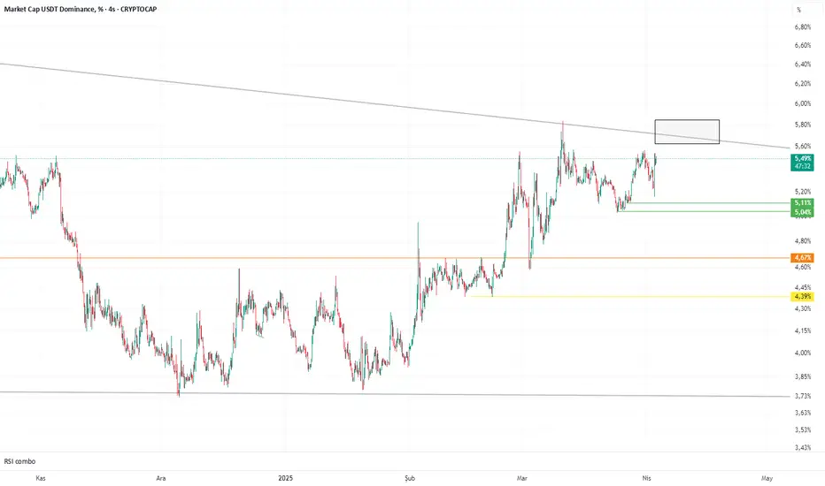 Grafikte üst çizgi kırılırsa ve gösterdiğim kutunun üstünde tether dominansı , kapanışlar yaparsa yeniden değerlendiririz. Üst çizgiden tepki alıp aşağı doğru hareket ederse altcoin fiyatlarında olası yükselişler çıkış fırsatı olabilir. Muhakkak bir çıkış planı yapın.