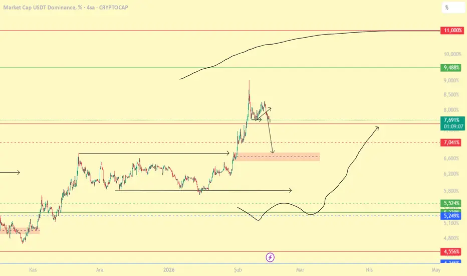 burdan alt kırmızı kutuya kadar test beklenebilir btc içinde bu 80-82k bölgesine denk geliyor buradan sonra market yapısına göre tekrar short kovalamak gerekebilir eğer alt bölgede işaretlediğim 5.2 seviyesine gelirse buradan en tepe olan 11 seviyesi muhtemel btc fiyatı olarak da 48k civarına denk geliyo olması lazım.