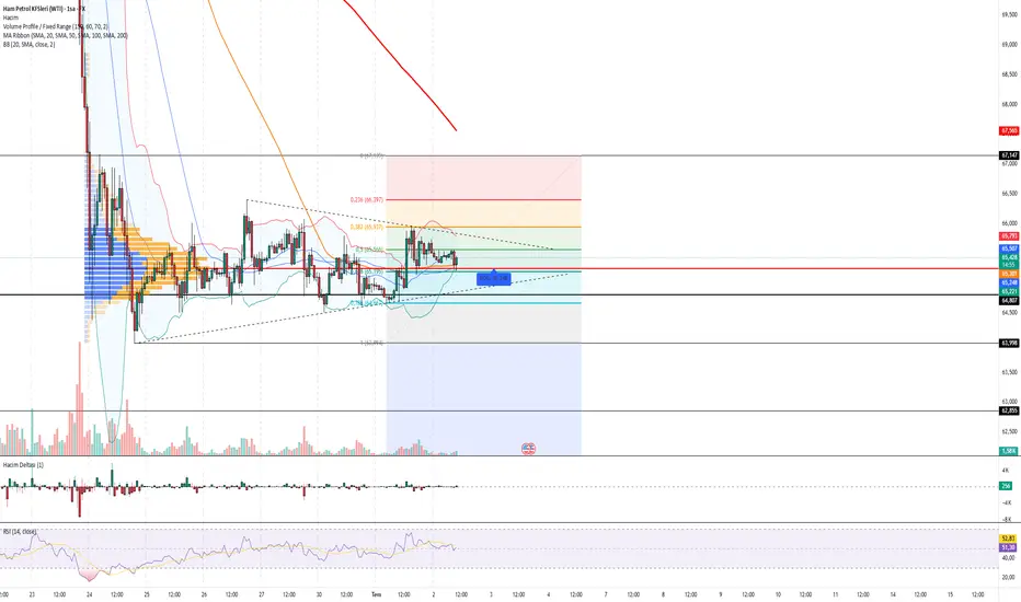 Grafikte simetrik üçgen benzeri bir yapı dikkat çekiyor. Fiyat 65,00–65,80 aralığında sıkışmış durumda ve yön arayışı mevcut.