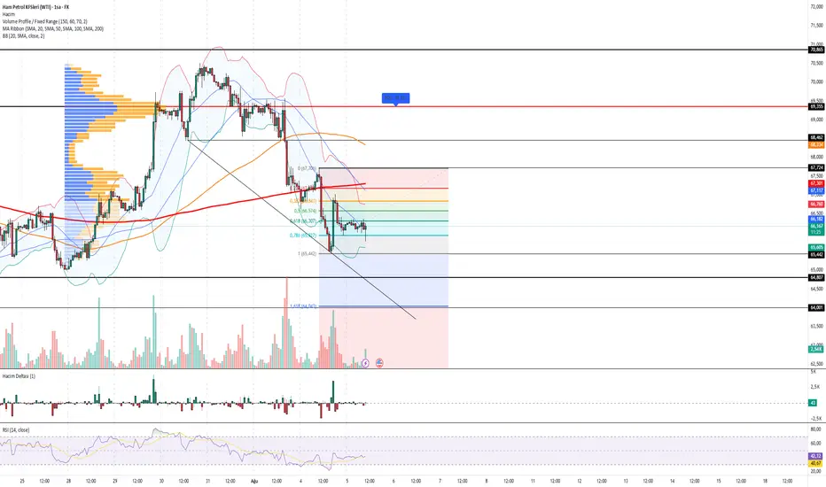 Fiyat, son sert düşüşün ardından Fib 0,618 ($66.30) bölgesinde yatay seyrediyor. Genel yapı hâlen alçalan trend içerisinde. Yukarı yönlü tepki girişimlerinde $66.75 – $67.30 bandı ilk güçlü direnç olarak öne çıkıyor. Bu bölge kırılmadıkça trend dönüşü teyidi zayıf kalır.