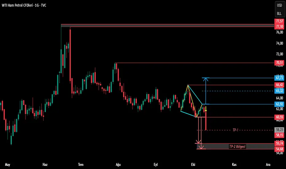 Günlük zaman diliminde oluşan iki yönlü formasyondan düşüş formasyonu hacimli bir mum ile SELL sinyali oluşturdu. Direkt TP1 seviyesine ulaşan fiyat için hala 1,5 ile 2,5 dolar civarında düşüş ihtimali mevcut.