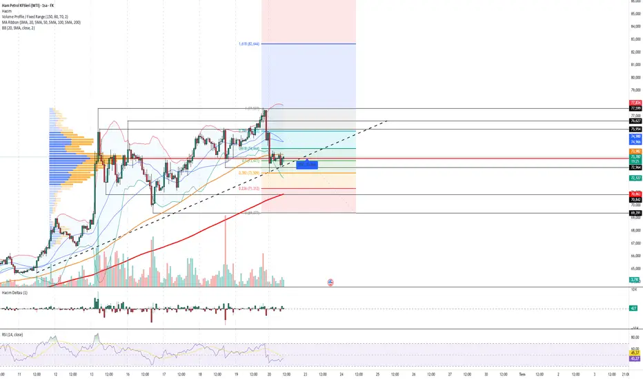 Grafikte fiyat 73,85 $ civarında konsolide oluyor. Öncesinde 77,59 $ seviyesinden başlayan düşüş, Fibonacci 0.618 (74,44 $) bölgesine kadar toparlandı ancak bu direnç aşılamadı. Fiyat şu anda yatay kanalın alt bandında ve hacim düşük.