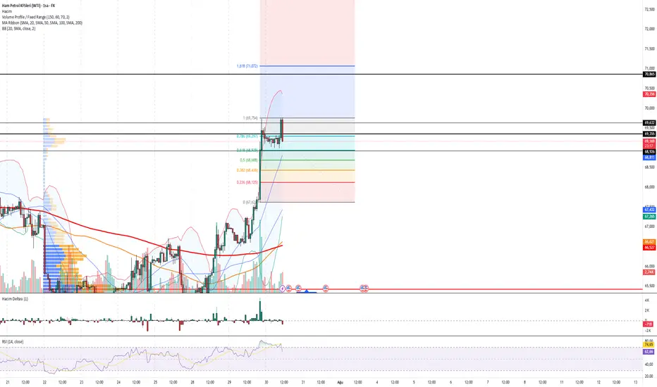 Fiyat 67.20’den başlayan güçlü yükseliş sonrası 69.75 bölgesinde dirençle karşılaştı. Yükselen trend korunurken fiyat 0.786 Fibonacci seviyesinde duraksıyor. Hacim azalmakta, yukarı yönlü kırılım için yeni katalizör gerekebilir. Kanal üst bandı test ediliyor.