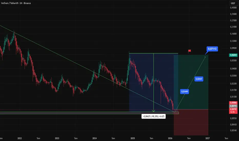VeChain (VET), blokzincir teknolojisini "gerçek dünya" sorunlarına, özellikle tedarik zinciri yönetimi ve sürdürülebilirlik süreçlerine entegre etmeyi amaçlayan, dünyanın en köklü kurumsal odaklı Katman-1 (Layer-1) projelerinden biridir. An itibari ile fiyatı 0,00805$ teknik görünüm olarak DUK oluştu ve düzletmenin kısmen tamamladığını söyleye biliriz. Hacim yeterli değil henüz ancak düşen piyasa da kötü bir hacim değil ancak kısa da sert hareketler gerçekleşe bilir.
