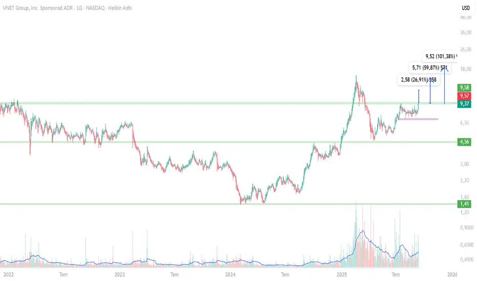 Bölge: 2022’den gelen ana arz/direnç bandı 9,30–9,60 test ediliyor. Son yükselişlerde hacim artışı belirgin. Altta kısa vadeli mor destek bölgesi ~7,6–7,8, daha altta orta vade desteği 4,56.