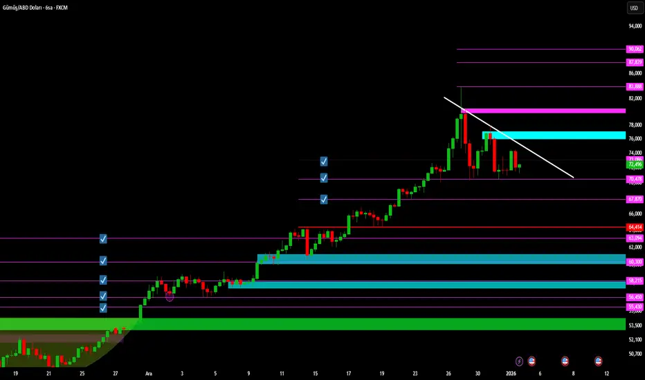 Bunlardan ilki beyaz alçalan direnç hattı, diğeri ise 77,20 seviyesinde yer alan turkuaz blok bölgesi. Fiyatın bu iki seviye üzerinde alıcılık ve kalıcılık sağlaması halinde, yeniden 83 – 87 – 90 hedefli yükseliş atakları gündeme gelebilir.