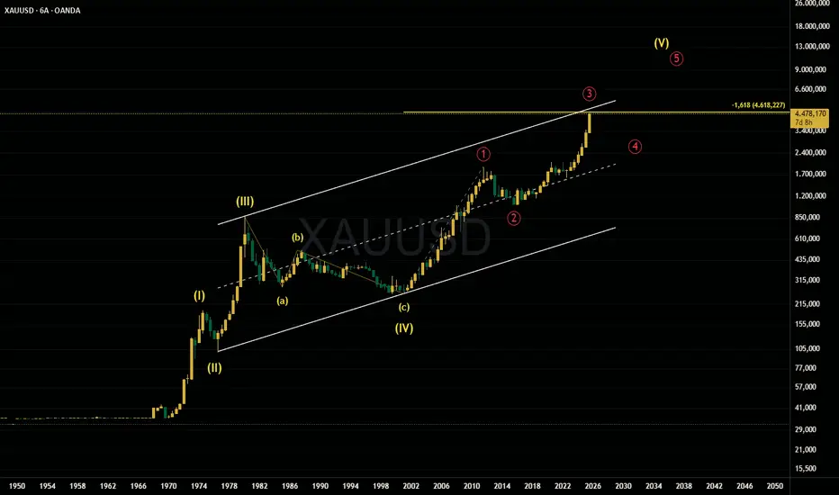 Bugün sizlerle Altın (XAUUSD) grafiğine çok geniş bir perspektiften, 1970'lerden günümüze uzanan Grand Supercycle (Büyük Süper Döngü) penceresinden bakacağız. Fiyatın tarihsel döngüleri ve matematiksel hedefleri, önümüzde çok kritik bir karar bölgesinin (Decision Zone) olduğunu gösteriyor.