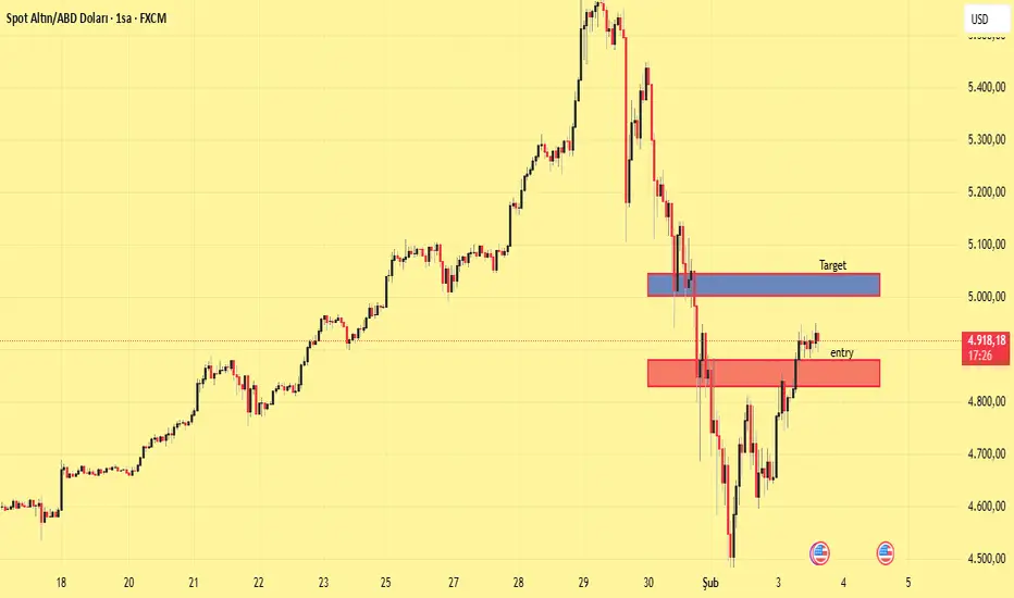Altın, daha önce güçlü bir yükseliş impulsu oluşturduktan sonra kısa vadeli yapıyı kıran sert bir düşüş yaşadı. Bu agresif satışın ardından fiyat yüksek volatilite gösterdi ve şu anda düzeltme (retracement) fazı içinde, önemli bir arz / direnç bölgesine doğru hareket ediyor.