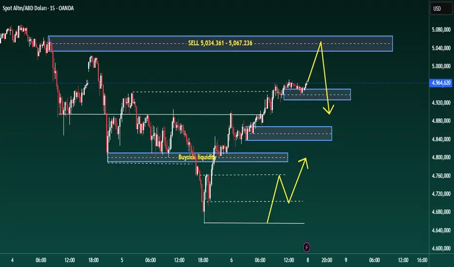 M15 yapısında fiyat, kısa vadeli bir güç göstergesi olarak daha yüksek dipler oluşturdu. Ancak, bu hareket hâlâ daha geniş bir düzeltici aşama içinde gerçekleşiyor, kesin bir trend tersine çevirme değil. 5034 – 5067 aralığındaki üst bölge, önceki dağılım ve intraday direnç ile uyumlu olarak ana SATIŞ likidite alanı olmaya devam ediyor.
