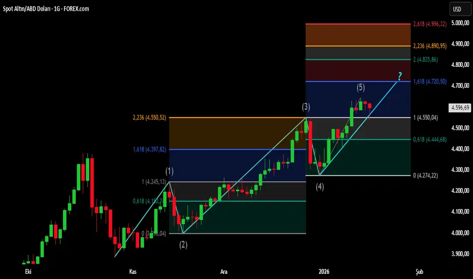 Ana grafiğimizde 5'li bir yükseliş dalga yapısı olduğu üzerinden gidecek olursak, Beşinci dalga bitti mi, ya da bitmediyse nerede bitebileceği sorusunun cevabını aramakla başlayalım işe. 1'den 2'ye çekilen Fibonacci Retracement sonrası üçüncü dalganın tam fibonacci 2.236 seviyesinde sonlandığını görüyoruz. Fiyatın her zaman fibonacci seviyelerine nokta atış yapacağını düşünmek doğru değil.Bazen bu seviyelerin biraz aşağısı, bazen ise biraz yukarısı fiyatın hedefi olabilir. Buradan yola çıkarak, 3'ten 4'e çekilen fibonacci retracement sonrası fiyatın önündeki ilke fibonacci seviyesinin 1.618 seviyesi olan 4720 olduğunu görmekteyiz. Öyleyse, mevcut seviyeden bir dönüş yaşanmadığı taktirde, fiyatın en az bu seviyeyi hedefleyebileceğini düşünmemiz yanlış olmayacaktır. Hatta daha yukarıdaki fibonacci seviyelerini hedefleme ihtimali de mevcuttur.