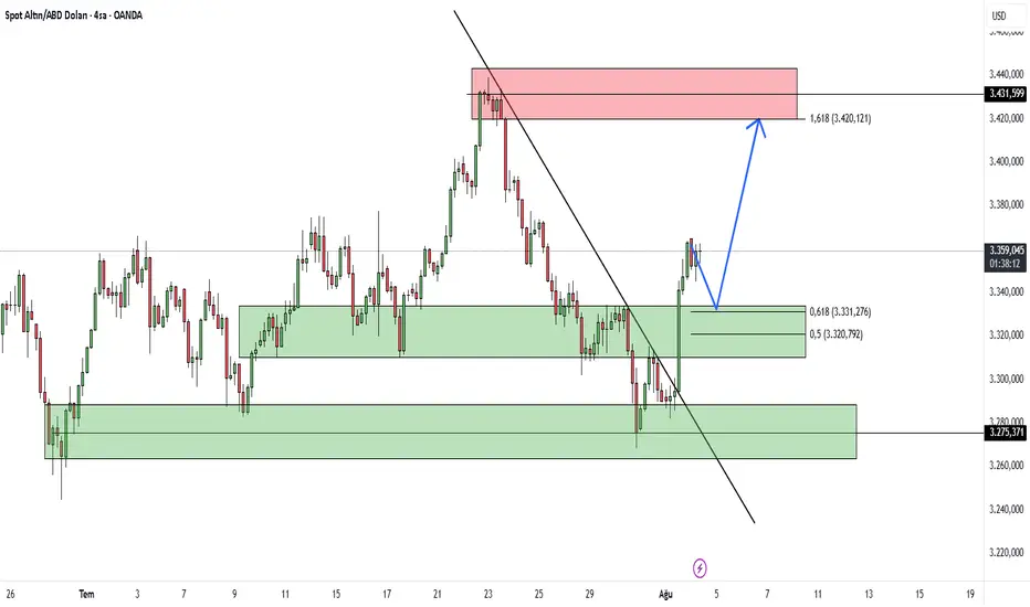 Grafiğe baktığımızda, yükseliş henüz bitmiş gibi durmuyor. Şu an yaşanan sadece küçük bir düzeltme — yani güç toplama evresi. Fiyat şu anda 3.360 dolar civarında dolanıyor ve son seanslardan beri pek değişmedi.
