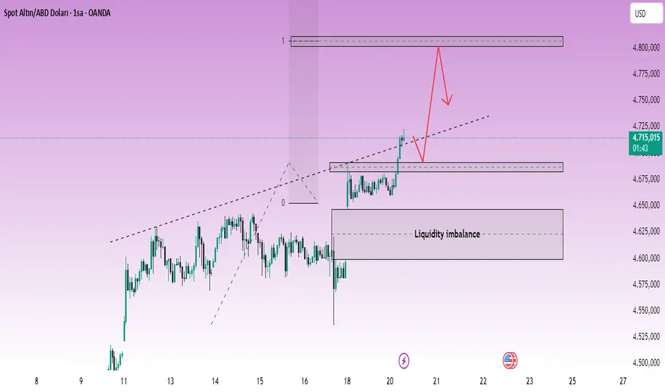 4687–4690, grafikte ana seviye olarak vurgulanan kritik alan. Fiyat burayı aştıktan sonra, bu bölge yeni destek (önceki direnç destek olur) olarak işlev görebilir. Eğer fiyat bu bölgeyi test edip, net bir red ile (fitil, boğa kapsama, güçlü sıçrama) tutunursa, bu, trendle uyumlu olarak daha yüksek olasılıklı bir alım yeri olacaktır.