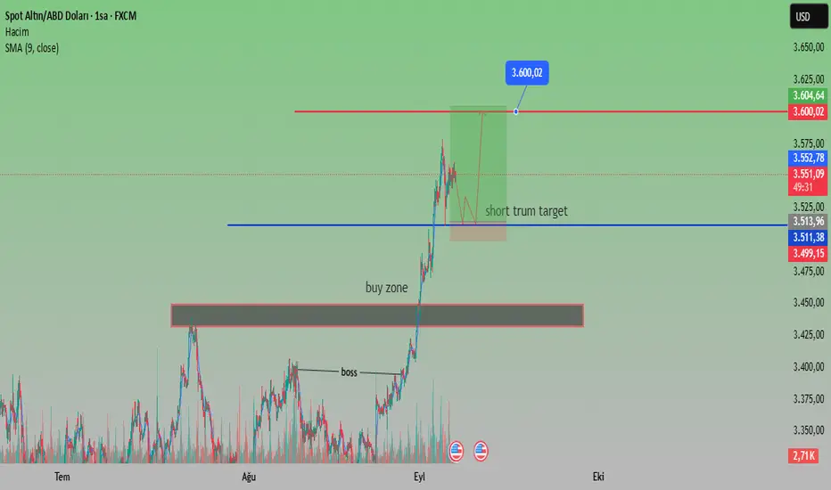 Şu anda altın 3.548 $ seviyesinde işlem görüyor ve kısa vadeli hedef 3.600 $ olarak belirlenmiş durumda. Grafik, yeni bir yükseliş hamlesinden önce vurgulanan bölgede olası bir konsolidasyona işaret ediyor. 3.552 $ seviyesindeki SMA (9) dinamik destek görevi görerek yükseliş eğilimini güçlü tutuyor.