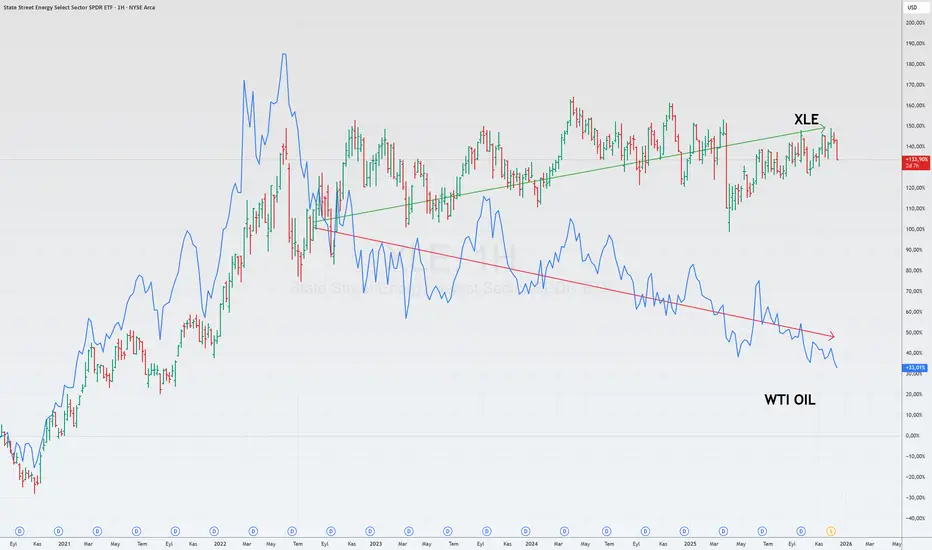 Özellikle, bu ayrışma başladığından beri, petrol fiyatları düşerken bile XLE hafifçe yükseldi.