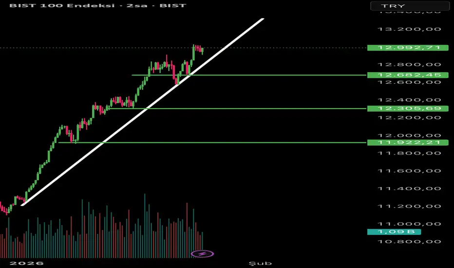 BIST100 tarafında yapı net şekilde yükseliş trendinde. Beyaz trend çizgisi gayet temiz çalışıyor, fiyat her geri çekilmede buradan destek alıp yoluna devam etmiş. Şu an 12.680 bandı kısa vadede onay/destek bölgesi, bunun üzerinde kaldığı sürece yukarı yönlü senaryo bozulmaz.