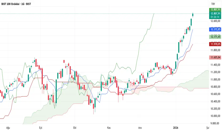 İchimoku bulutunun yeşil olması, piyasanın yukarı yönlü olduğunu ve alıcıların hâkim olduğunu işaret ediyor. Fiyat, mavi çizginin üzerinde kalmış, bu da kısa vadeli yükselişin devam ettiğini gösteriyor. Ayrıca, fiyatın kırmızı çizginin üzerine çıkması, güçlü bir alım sinyali olarak yorumlanabilir.