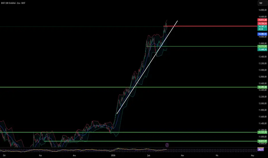 BIST 100 grafiğine baktığımızda, endeksin kesintisiz bir yükseliş trendi içinde ilerlediğini ve son direnç noktası olan 14.326 seviyesine ulaştığını görüyoruz. Eğer bu direnç kırılabilirse, sıradaki hedefin 14.500 seviyesi olması beklenebilir. Bu bölgenin de aşılması durumunda ise yükselişin 15.000 seviyesine kadar devam etme potansiyeli bulunuyor.