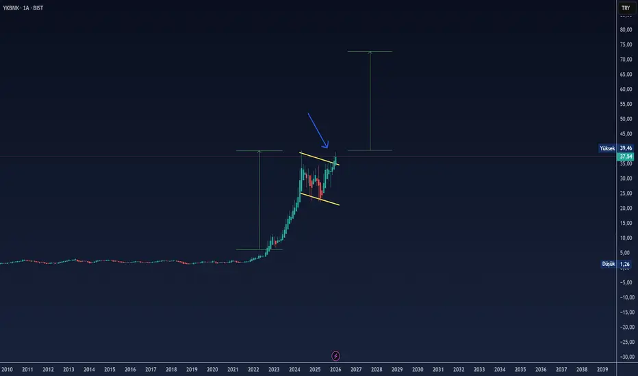 2024 yılından itibaren yatay konsolidasyon sürecini tamamlayan hissemizde, uzun vadeli trend kırılımı gerçekleşmiştir. Teknik yapı korunması halinde uzun vadeli hedef 72 seviyesi takip edilebilir.