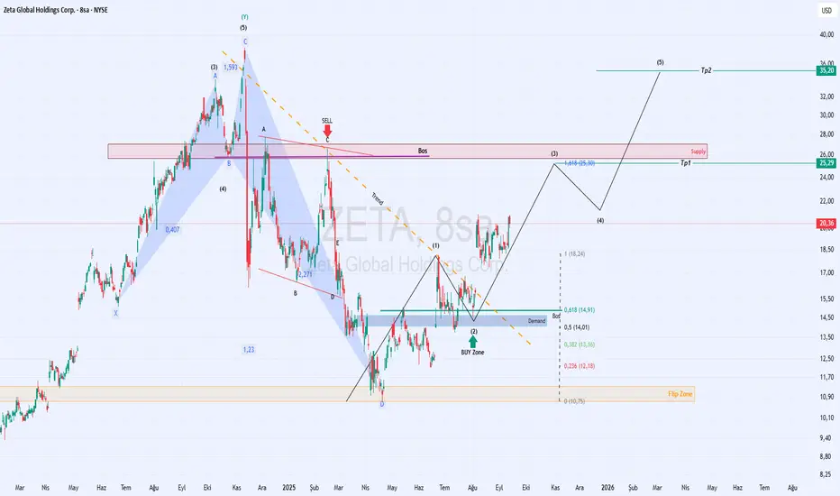 Grafikte 2024 tepesinden sonra oluşan düzeltme, hem Elliott (ABC + WXY kombinasyonu) hem de harmonik pattern ile desteklenen bir dip yapısı oluşturdu. 10,75 seviyesi “Flip Zone” olarak güçlü bir taban bölgesi işlevi gördü. Bu seviyeden başlayan yükselişte: