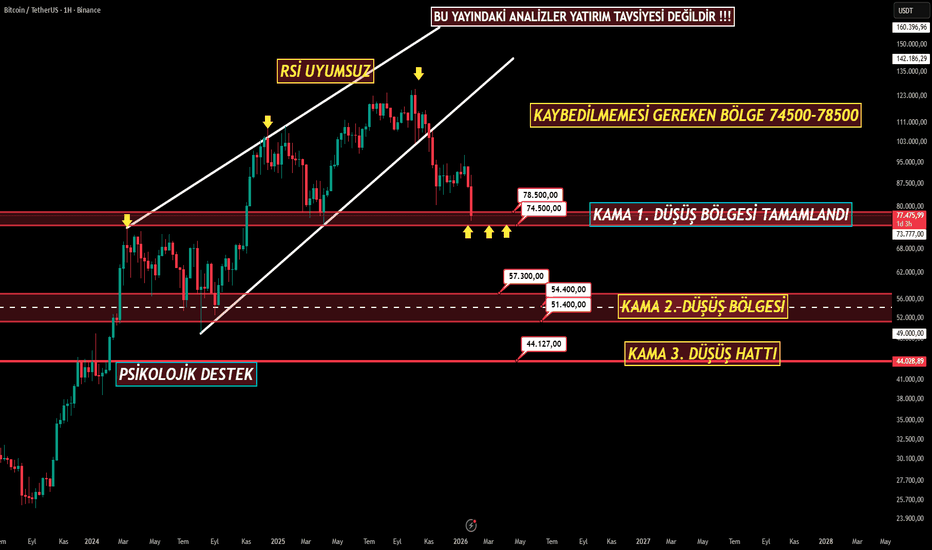 BTCUSDT SON KALE SAVUNULACAK MI?btcusdt 1 haftalık grafikte yükselen kama. youtube yayınlarımızda kasım ve aralık 2025’ten beri bağırarak söylediğimiz 78.500 hedefimiz geldi. şimdi burası savunulacak mı? 74.500–78.500 hattı altında haftalık kapanış , düşüşleri derinleştirebilir. Bölge kaybedilse bile tekrar üstüne atılmalı !!!