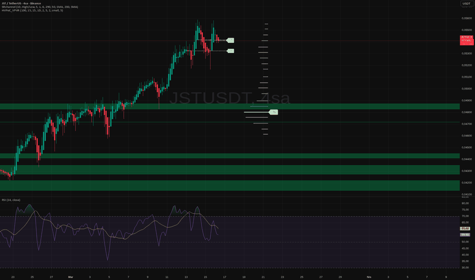 4 saatlik grafikte fiyat tepedeki dar bantta sıkışmış, RSI da 60’tan aşağıya doğru sarkarak yorulma sinyali veriyor. Hacim profiline baktığımda 0.048 civarında kalın bir talep bloğu, altında da 0.043 - 0.041 bandında ciddi alıcı kümelenmesi var. Bu yüzden ana senaryom short değil, “sağlam geri çekilme sonrası long” senaryosu: önce stop avı ile 0.048 ve altına iğne, sonra alıcılar devreye girerse yeniden 0.055 - 0.058 bandı hedef olabilir.