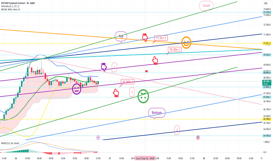 2. Uzun pozisyonun ilk hedefi 70.304,1$ -> Tepe, sonra İyi. Strateji başarılı olursa, uzun pozisyona yeniden giriş için hedef 68.896$'dır.