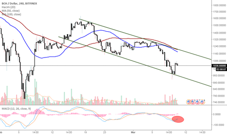 Bitcoin Cash ile ilgili yeni bir çalışma hazırlamak istedim. MACD bize kısa vadede küçük yükselişler için olumlu sinyaller versede daha uzun bir vadede MA50'nin MA100'ü henüz yukarı yönde kesemediğini görüyoruz. Yeşil hatlarla göstermiş olduğum düşüş kanalından yukarı yönde bir sıçrama yükseliş için bize olumlu sinyaller verecektir. Ancak yeşil hattın aşağı yönde kırılması düşüş hareketlerini sertleştirecektir. Şimdilik BCH'nin düşüş kanalından hangi yöne doğru sıçrayacağına bakalım.
