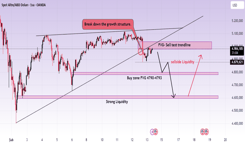 Trend çizgisi yapısının kırılması genellikle bir devam etmeden önce yeniden test ile sonuçlanır. Altın, 5,020 alanını güçlü bir şekilde yeniden kazanmadıkça, mevcut konsolidasyon likidite odaklı aşağı yönlü bir harekete hazırlık gibi görünüyor.