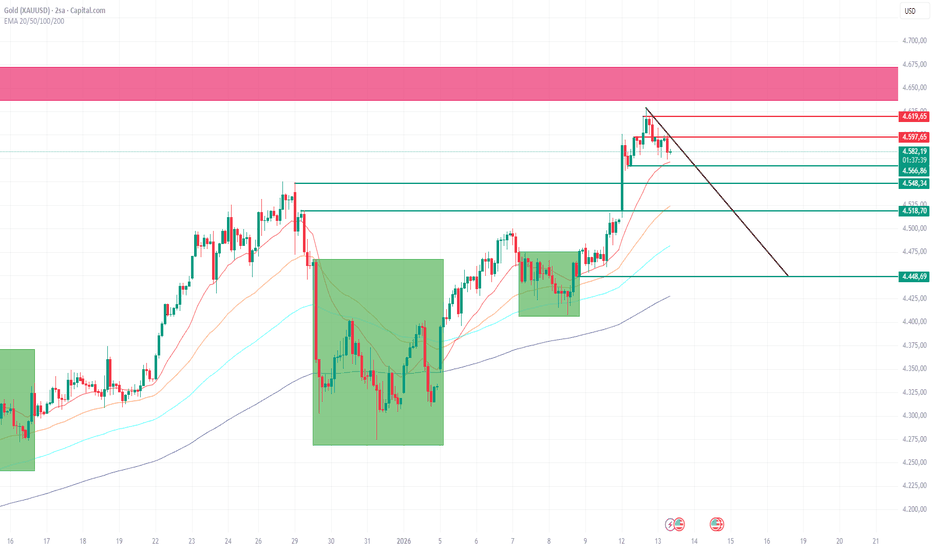 GOLD 2 H GOLD grafiğini incelediğimizde, fiyatın zirve seviyelere ulaştığını ancak 4620 seviyesinden güçlü bir satış baskısıyla karşılaşarak geri çekildiğini net bir şekilde görebiliyoruz. Bu bölge, fiyat için önemli bir direnç alanı olarak çalışmış ve gelen tepkilerle birlikte aşağı yönlü hareket başlamıştır.