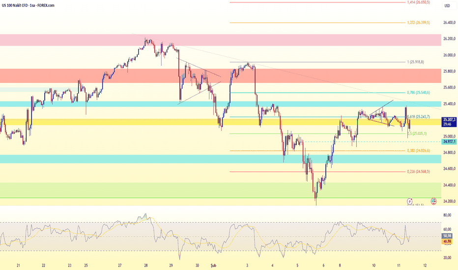NASDAQ 1 saatlik grafikte yükseliş sonrası yatay – hafif aşağı yönlü bir konsolidasyon sürecine girmiş durumda. Özellikle 25.300 – 25.414 bandı güçlü bir direnç bölgesi olarak çalışıyor. Fiyat bu bölgeyi birkaç kez test etmesine rağmen kalıcı kırılım üretemedi ve satış baskısıyla karşılaştı.