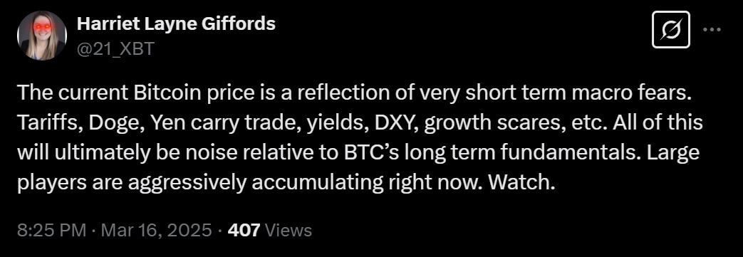 The analyst briefly cites several reasons for Bitcoin’s recent price weakness, including “Tariffs, Doge, Yen carry trade, yields, DXY, growth scares,” but concludes that none of these factors alter Bitcoin’s long-term fundamentals, suggesting its price will eventually benefit.