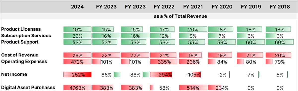 However, nearly every other line item is impacted by the high cost of Bitcoin acquisition (in previous FYs) and the unrealized gains/losses of holding such a volatile asset.