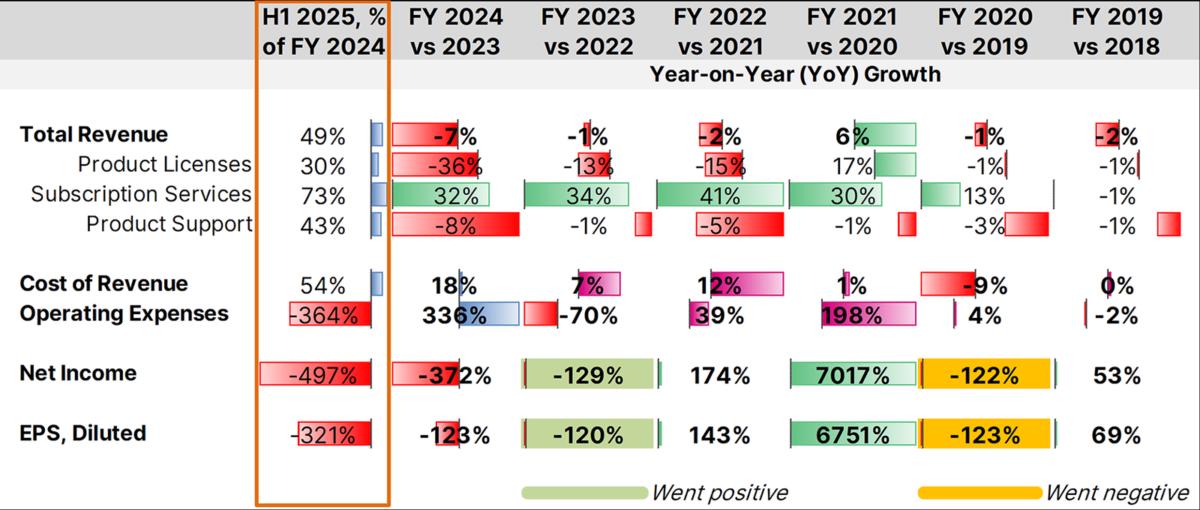 While revenues from its then-mainstay technology business saw a slight overall uptick in FY 2021, it has been in decline since. Currently, trends indicate that revenue will likely close out the current FY with a 2% decline. However, subscription licenses of MicroStrategy One – an AI-powered business intelligence (BI) platform that combines analytics and AI capabilities much like those on offer from Oracle and Microsoft – continues to grow from existing users year on year.