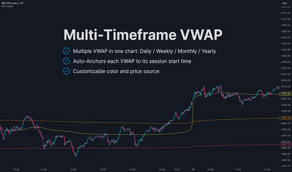 1. Multiple Timeframes, One View: Visualize Daily, Weekly, Monthly, and Yearly VWAP calculations simultaneously on a single chart.