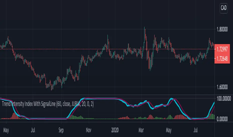 When TrendIntensity(aqua) is above SignalMa (maroon), it implies a bullish sentiment.