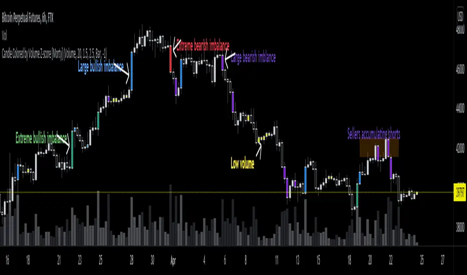 This indicator colors the candles according to the z-score of the trading volume. You can easily see the imbalance on the chart. You can use it at any timeframe.