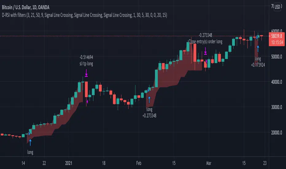 Since the publication of the Delta-RSI Oscillator script, I have been asked many times to make it compatible with the Strategy Tester and add filtering criteria to minimize "false" signals. This version covers many of these requests. Feel free to insert your favorite D-RSI parameters and play around!