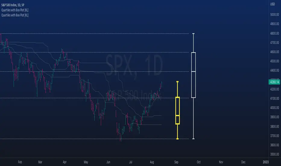 This script has a feature that allows moving percentiles (moving values of Q1, Q2, and Q3) to be shown. This can be applied for trading in ways such as: