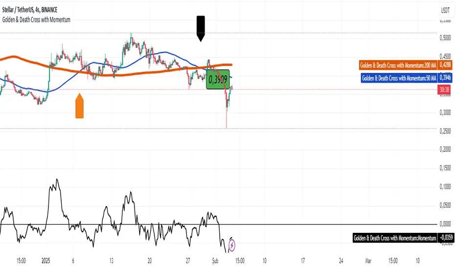 Kripto ve hisse senetleri piyasasında 4 saatlik ( günlükte de fena sayılmaz ) ( Golden Cross ve Death Cross, hareketli ortalamaların kesişim noktalarını belirleyerek piyasadaki trend değişikliklerine işaret eden önemli teknik analiz araçlarıdır. Bunları Momentum Göstergesi (MOM) ile birlikte kullanmak, yatırımcılara piyasa hareketlerine dair daha derinlemesine bir bakış açısı sunabilir. ) olarak çalışan basit bir indikatördür. Yatırım amaçlı değil eğitsel amaçlı bir çalışmadır.